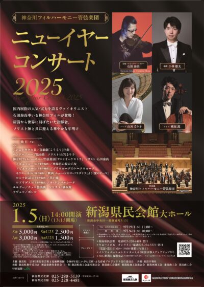 国内屈指の人気・実力を誇るヴァイオリニスト石田泰尚率いる神奈川フィルが登場!新潟から世界に羽ばたいた指揮者、ソリスト陣と共に迎える華やかな年明け