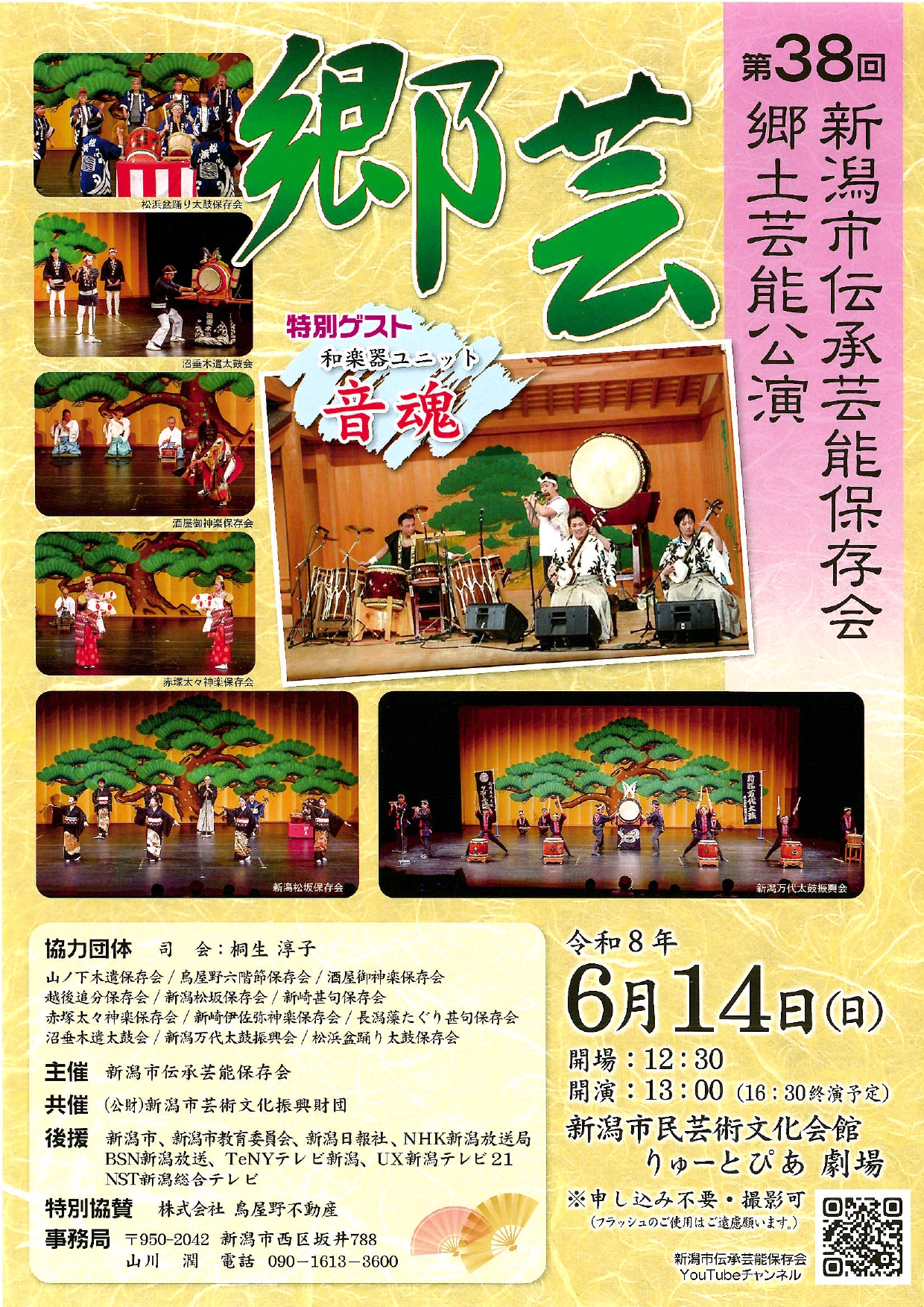 第38回新潟市郷土芸能公演「郷芸」 チラシPDF 古典 第38回新潟市郷土芸能公演「郷芸」 シェアする Tweet 開催日時 :2026年6月14日(日)13:00 ~ 16:30(開場 12:30) 会場 :劇場 チケット料金・お申し込み チケット:無料(事前申込不要) お得な情報 :- サービス情報 :- 主催 :- お問い合わせ :事務局090-1613-3600 お問い合わせ 事務局090-1613-3600 公演・イベント一覧に戻る
